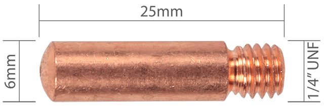 Contact tips to suit Tweco 1 & Lincoln Magnum 100L style MIG torches. 25mm long x 6mm body x 1/4in UNF thread. No quality short-cuts, designed for consistancy and long-life.