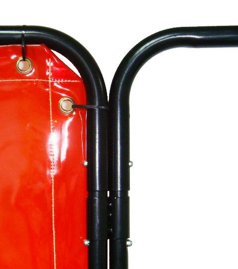 Economical series welding screens, curtain frames, and kits. Steel pipe frames with quick spring-pin joints. Available as frame only, or in kit form with curtain included, in 1.8x1.8m or 1.8x2.0m, red or green. Includes connector brackets that allows multiple frames to be joined together. Also available in heavy-duty series with RHS welded/bolted frames.