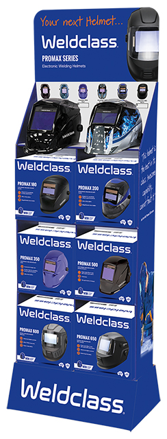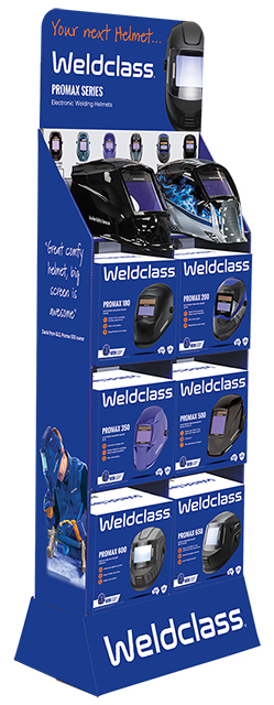 The ultimate point-of-sale (POS) display for your Weldclass Promax welding helmet range! Fits 8 welding helmets with top shelf designed to hold 2 helmets out of their box, for a try-before-you-buy customer experience. Eye catching professional graphics. Supercharge your helmet sales today!
