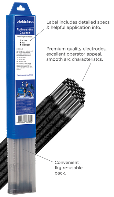 Popular and versatile NiFe-Cl type cast iron welding rod for high strength, hot or cold welding of; cast iron to itself (incl. grey / malleable, nodular, SG & austenitic cast irons) and cast iron to steel. Machineable weld deposit. Extremely soft, smooth arc with low spatter. Weld metal is stronger and more resistant to solidification cracking than the pure nickel electrode types (such as Ni-Cl). Classification: AWS ENiFe-CL. Available in blister/handy packs & 1kg re-usable packs, in 3.2mm.