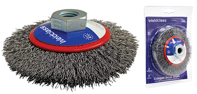 Bevel wire brush with angled saucer shape; Ideal for corners, channels, etc, as well as flat surfaces. Crimped wire for less-aggressive surface preparation; light rust removal, removing burrs, etc. Made in Europe, using high-tensile "tyre-cord" wire (as used in manufacture of high performance European motor vehicle tyres) for demanding industrial use and superior brush life.