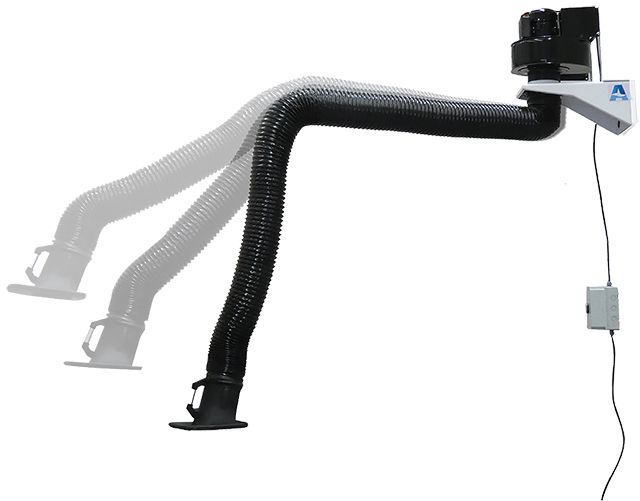 The ALLCLEAR® FA25 Fan is an efficient and cost-effective solution for removing dust and fumes, commonly used together with ducted systems where fumes are ducted externally and/or to large central extraction/filter units. This 240V extraction fan extracts airborne contaminants with minimal intrusion in tight workspaces. The pivoting suction arms are easy to position and stay securely in place. Choose from two arm lengths (3m or 4m) and enjoy features such as 2500m³/hr max airflow, 150mm diameter suction hose, a 160mm diameter intake nozzle hood, temperature resistance up to 120ºC, a flexible PVC suction hose with a welded steel wire coil, and a wall-mounted bracket.